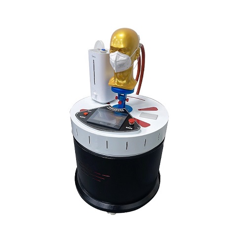 模擬穿戴預處(chù)理機,由呼吸模擬(nǐ)器、試(shì)驗頭模、飽和水蒸氣發生裝置、溫度控製裝置、 流量計等組成(chéng),可控(kòng)製呼(hū)吸模擬(nǐ)器以25次/分鍾,每次2L的呼吸量運(yùn)行。可控製頭模嘴巴(bā)附近飽和水蒸氣的溫度為(37+2) °。開啟預(yù)處理裝置,使呼吸裝置及(jí)飽和水蒸(zhēng)氣發生(shēng)裝置進入工作狀態,直到達到穩定。將呼氣器以氣密的方式(shì)佩戴在(zài)匹配的試驗頭模上,測試20分鍾左右。從呼吸器上取下顆粒物過濾材料,然後重新安裝上(shàng)去,繼續重複測試10次。